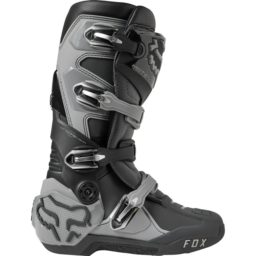 Included as part of the all-new design of the Motion Boots is the updated buckle and closure system. This 4-buckle design features new, patented forged metal buckles. This system provides a durable, secure closure for a precise fit and includes extended-length levers for easy opening and closing. The new ball and socket mechanism ensures your mobility is never compromised with this system, providing โfloatโ as the boots flex and contract while you ride. This buckle and closure system is the same across all Fox boots, but Motion Boots are designed with forged metal buckles for increased durability.