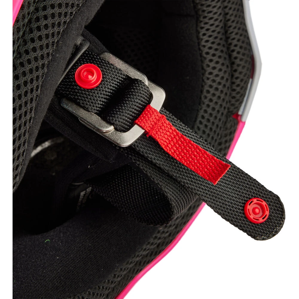 - Steel D-ring chin strap closure