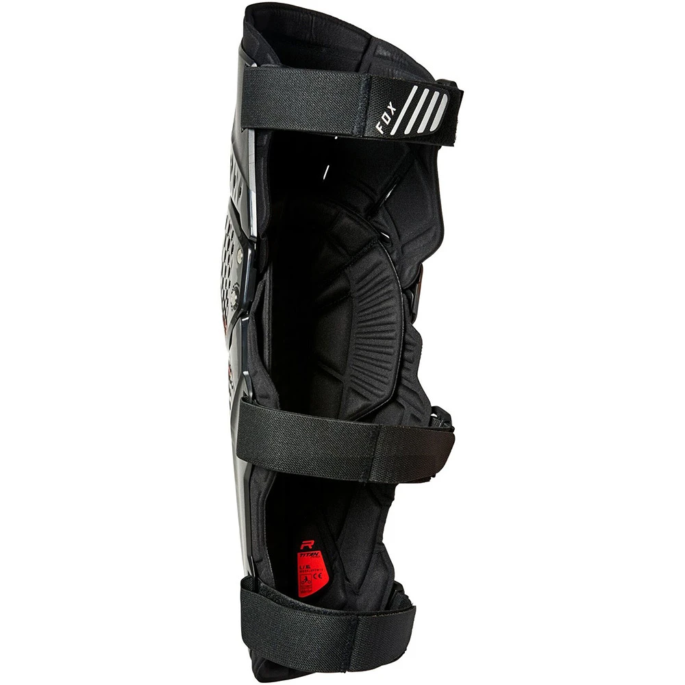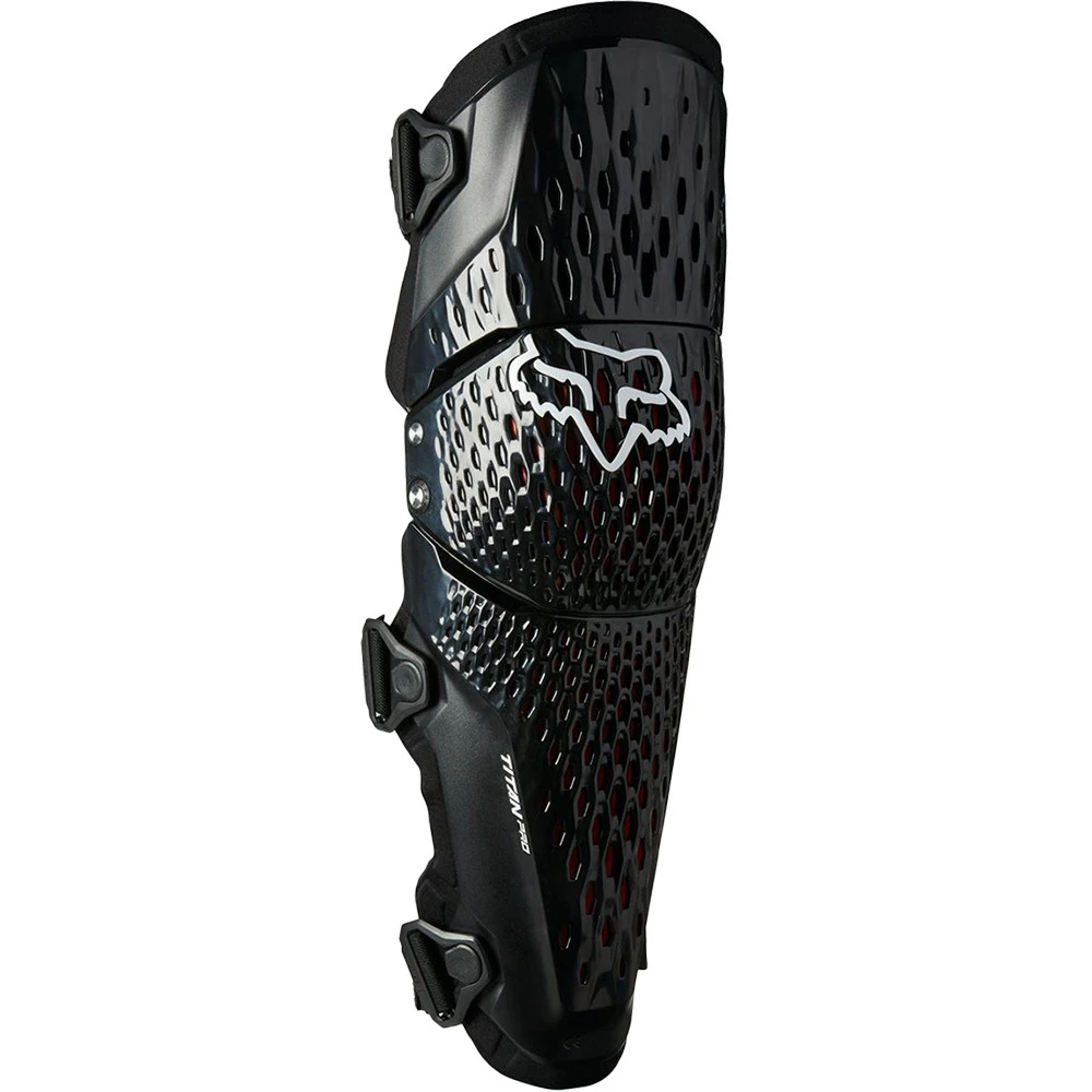 The Titan Pro-D3O® knee/shin guard is an all-new knee and shin coverage that integrates a highly-ventilated PP exoskeleton with specifically molded D3O® protective underneath. The Variable Axis Hinge provides an increased range of motion while the three straps hold the guard close to the body for added security, The Posi-Lock buckle system features one-time strap adjustment, and multi-layered molded foam provide comfort between the guard and your skin. For the rider that is looking for premium features and trusted technology in an affordable knee guard, the Titan Pro D3O is ready for action.